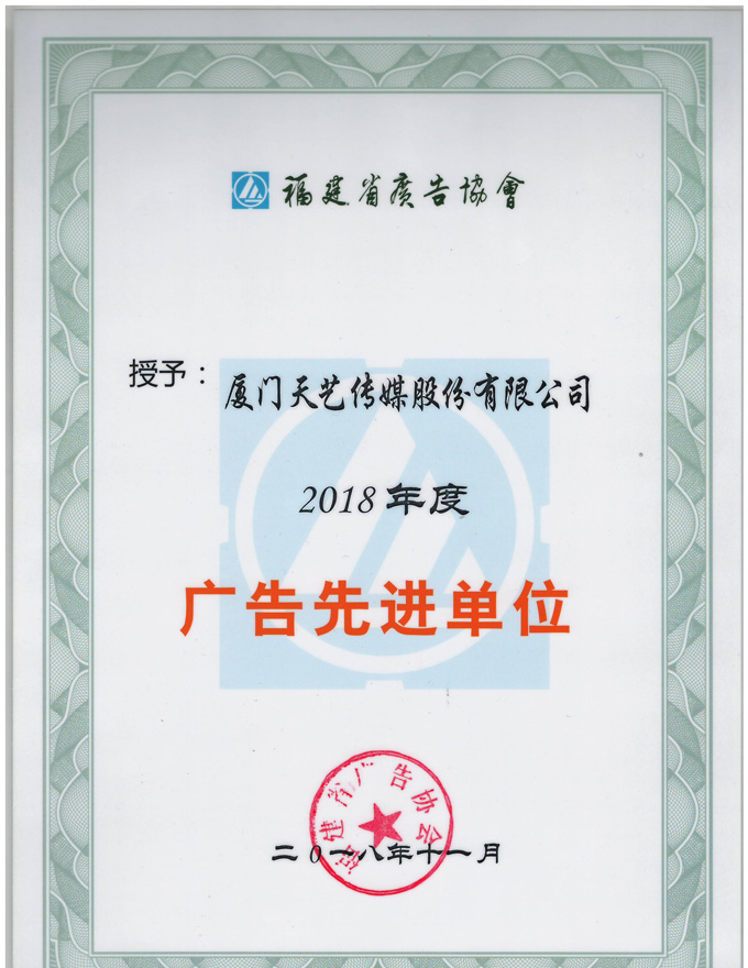 2018年福建省廣告界在推動(dòng)廣告業(yè)發(fā)展中,勇于開(kāi)拓,努力創(chuàng)新,取得了優(yōu)異的成績(jī),為福建經(jīng)濟(jì)發(fā)展和社會(huì)進(jìn)步作出了巨大貢獻(xiàn),涌現(xiàn)了一批先進(jìn)單位。為了表彰先進(jìn),樹(shù)立典型,推動(dòng)工作,再創(chuàng)輝煌,福建省廣告協(xié)會(huì)于12月20日舉辦了第七屆第三次理事會(huì),并授予了廈門市天藝傳媒股份有限公司“福建省廣告先進(jìn)單位”的稱號(hào)。
